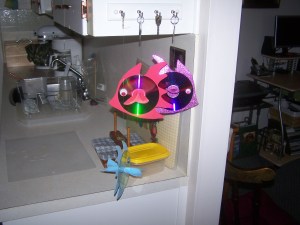 Heres something you can do with your old DVDs make fish mobiles. Color and charm makes for a nice conversation piece.