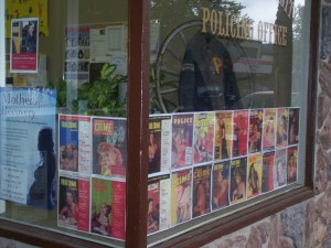 The downtown community police office had covers from 50’s era crime magazines, they all depicted a pretty women as a victim and protected by detective and police work.