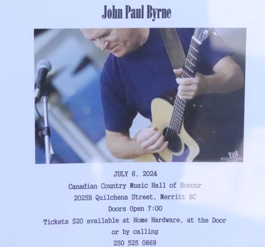 John Paul Byrne, Gordon Lightfoot tribute artist, will be at the Canadian Country music Hall of Honour in Merritt British Columbia on July 6th 2024, the doors will be open at 7:00 p.m.. The evening show will be in the building, tickets are available from Home Hardware or at the door or by calling 250-525-0869.