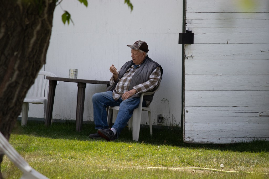 Lenard Male sits as the Octogenarian grooms his nails in the shade and oxygen enriched cool grass and trees of the downtown info center in Merritt BC.