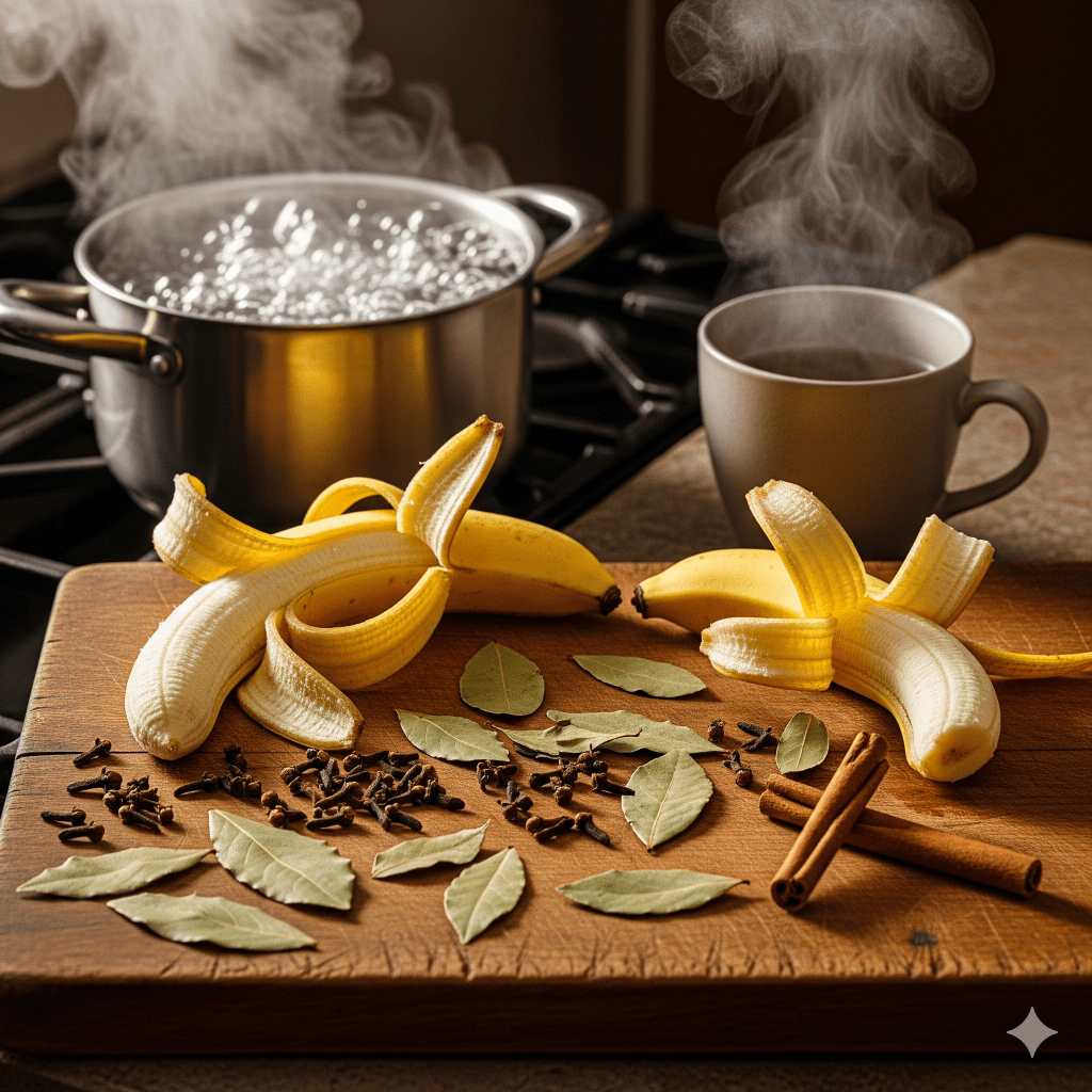 Quantities up to your instincts. Cut up a couple banana peels, add a handful of bay leaves, cinnamon either in sticks or powder, some cloves either whole or in powder and a quantity of water to your discretion. Boil it for 10 to 15 minutes.