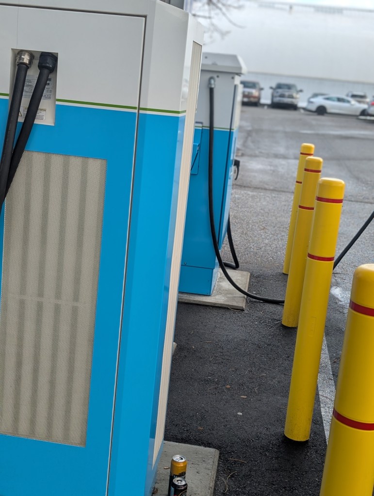Two fast chargers from BC hydro next to the tourist downtown information office at 2202 Voght Street in Merritt. Currently hooked up to a Late model Ford electric vehicle, crew cab truck.