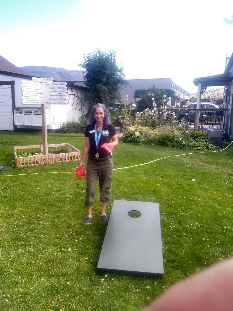 Leah demonstrates the new game toss at the downtown tourist info center known as the Bailee house,2202 Voght Merritt BC.
