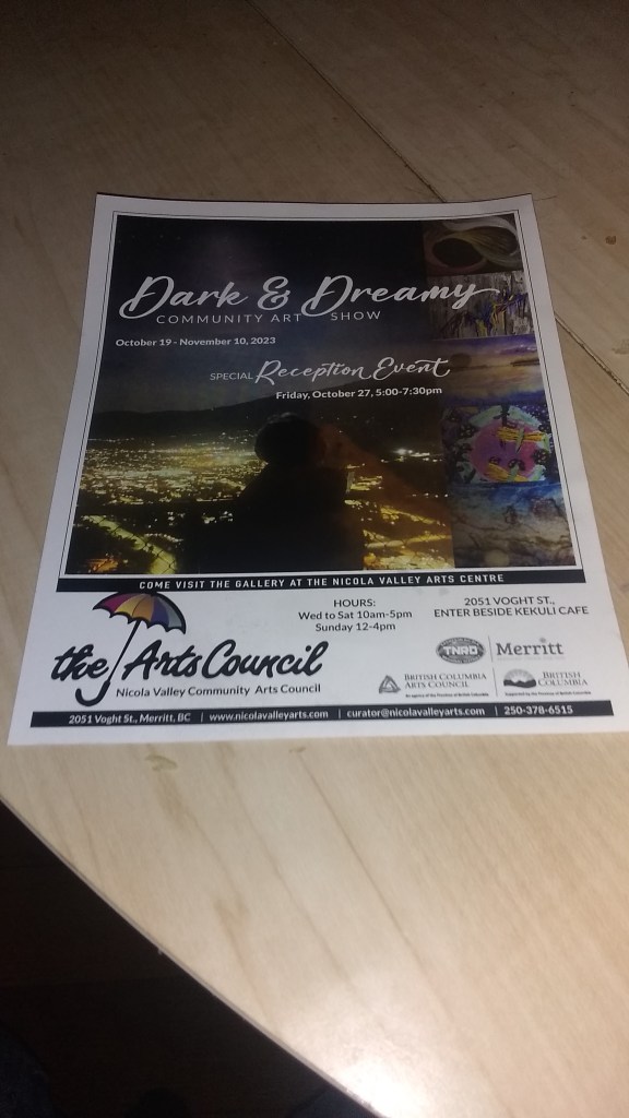 from Four to Seven today, there is an artists reception at the showing . The Gallery is at the Corner of Nicola and Voght in Merritt BC. Enter on the side of the Kekilui Restaurant.
