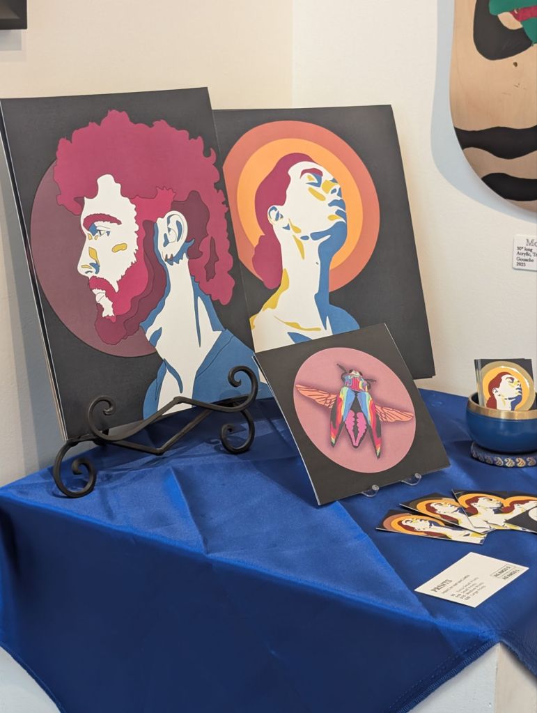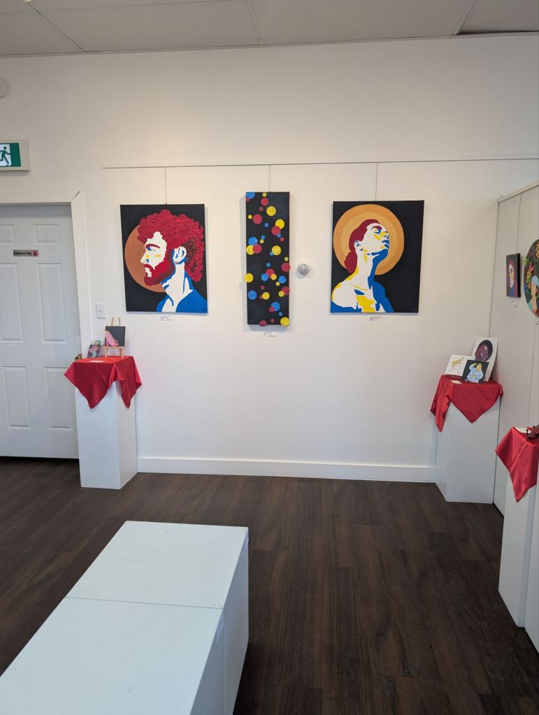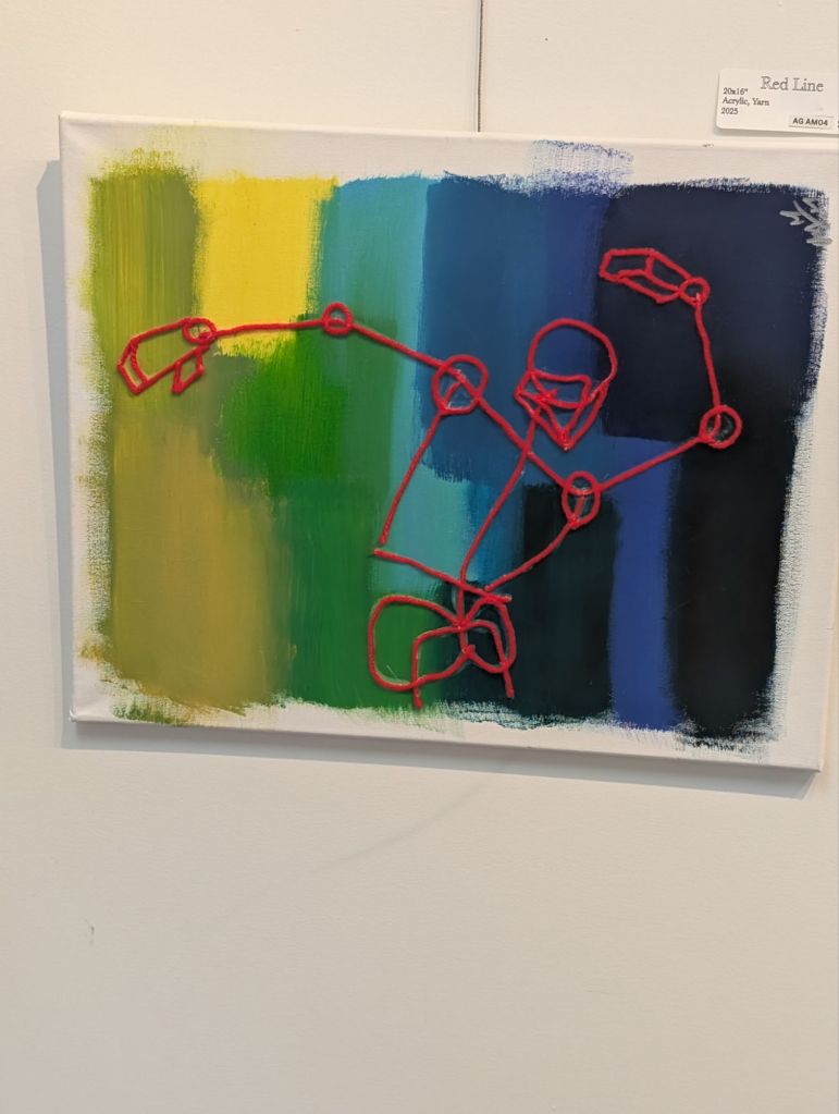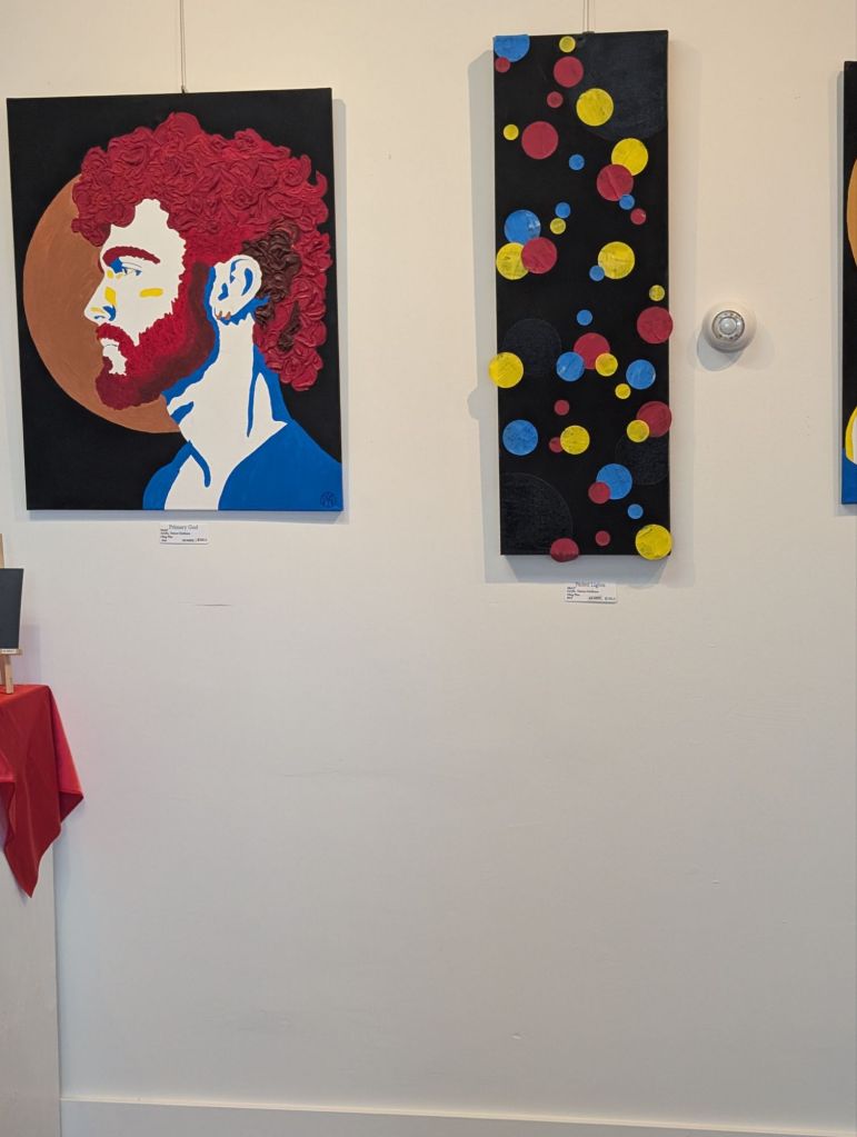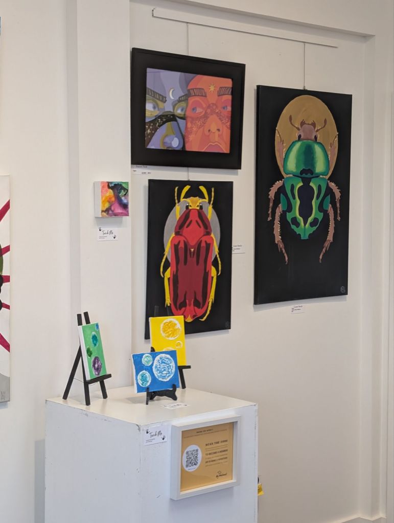 The show consists of numbers of small paintings, they’re anonymously and numbered and registered to their owners. They’re for sale ranges about $60 to $30 fundraiser for new lighting for the gallery.