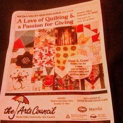 Gallery open 10 Am to 5 PM today. See quilt art from a half dozen exquisite quilters. Artist reception Friday 2-4 PM, at the Ars Center, corner of Nicola and Voght Merritt BC. Artists from flower to…